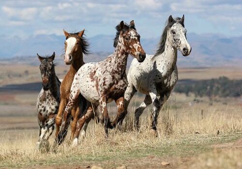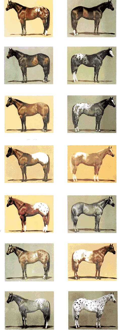 leopard: il cavallo presenta un colore bianco di base con macchie rotonde oppure a forma di uovo sopra tutto il corpo. Le macchie sono piccole verso la parte anteriore e diventano sempre più grandi intorno ai fianchi;