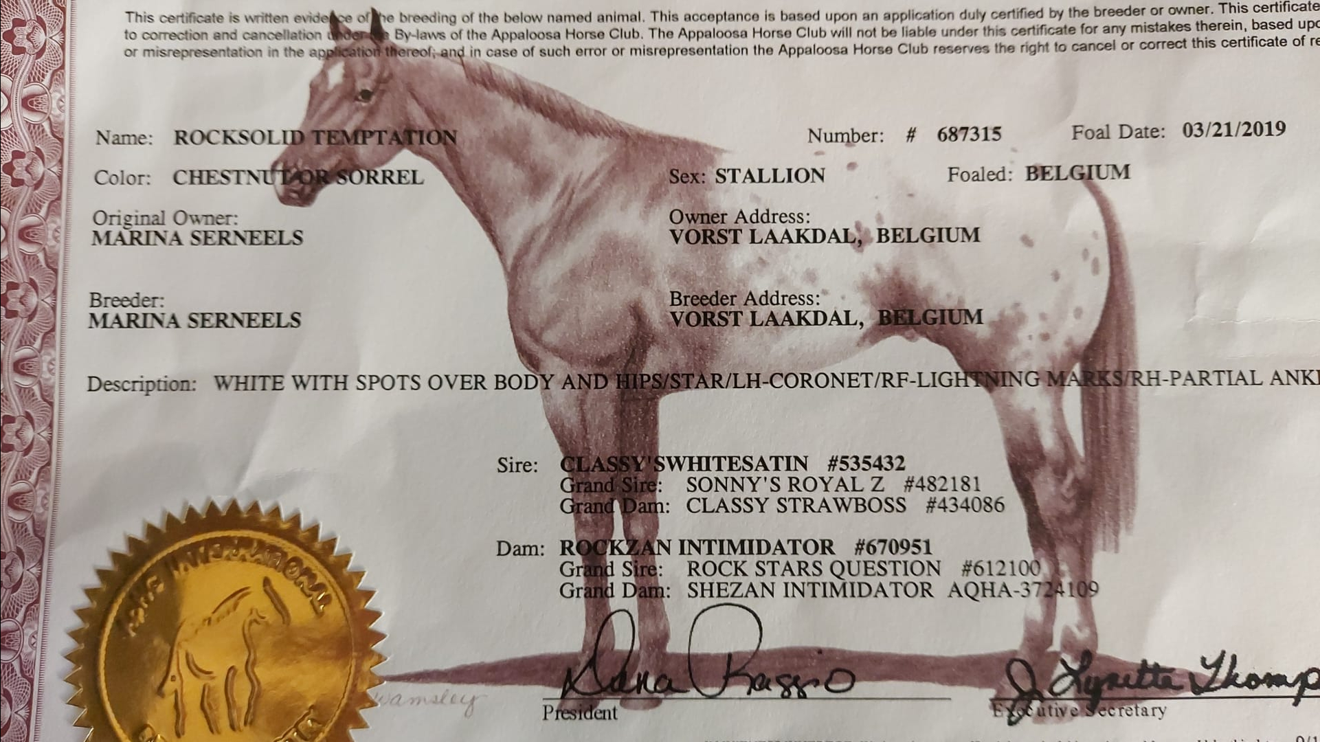 | Sire CLASSYSWHITESATIN ![]() w 15.3H 1994 APPALOOSA Few spot 1994 Europe Horse: 1st Halter Weanling Colts. 1996 Antwerp: 3th Halter Two year Old Colts. 2000 Multi Color Show: 1st Reining. 2000 European Championship: 5th freestyle Reining – 6th Open Reining. Multiple Open Reining Champion. | By SONNYS ROYAL Z ![]() dkb/br leopard 1989 APPALOOSA 3 halter points – 2 most colorful points. Sire of halter and performance point earners. |
