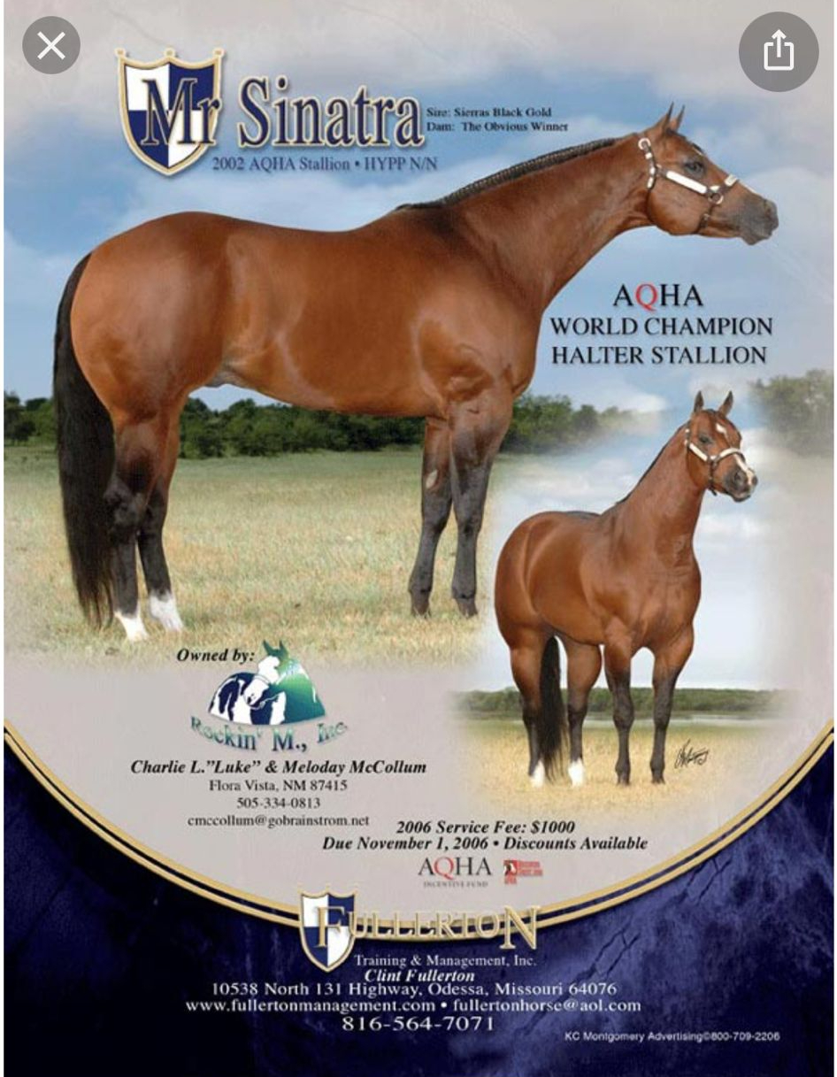 | Sire FRANKLY A DREAM ![]() b 16.2 2015 APPALOOSA ★ 2021 European Champion Most Colorful At Halter Italian & European Champion Producer ★ ITALIAN GRAND CHAMPION APPALOOSA STALLION AIA 2019 • Grand Champion Stallion AIA 2019 • Open Champion Aged Stallion AIA 2019 • Open Champion Most Colorful at Halter AIA 2019 • Open Champion Most Colorful at Halter Fieracavalli 2019 | By SINATRAFIED ![]() b 16.1 2010 QUARTER HORSE #AQHA R.Hind Coronet Homozygous Black(EE) HYPP N/N, HERDA N/N, GBED N/N, PSSM1 N/N, MH N/N AQHA Show H-??/P-0 2013 AQHA Select World Champion 3 YO Stallion Open and Amateur By MR SINATRA ![]() HYPP N/N, HERDA N/N, GBED N/N, PSSM1 N/N, MH N/N AQHA H-62.5 Superior Halter ROM Halter(Open & Amateur) 53 Times Grand Champion Halter 11 Times Reserve Grand Champion Halter 2005 World Champ Amateur 3-year-old Stallion 2003 World Show qualifier |