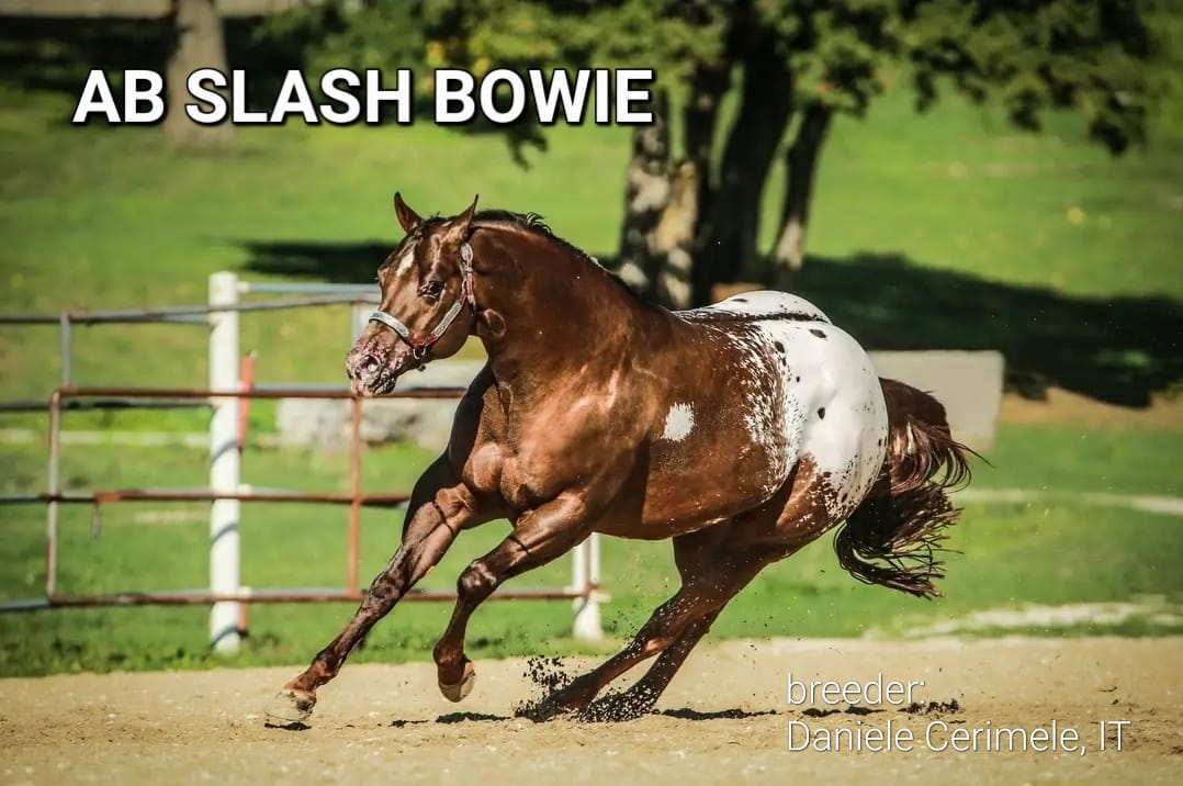 | Sire AB SLASH BOWIE ![]() b spotted blanket 2016 APPALOOSA World and National champion Halter | By PAY IT FORWARD ![]() APPALOOSA Aphc 660671 By LIVE THE DREAM ![]() YOB: COLOR: SEX: FOALED: (date?)(STATE?): MARKINGS: REG:#? GENETIC TESTS: PSSM N/P1 BREEDER: OWNER: SHOW/ACCOMPLISHMENTS: World Champ.1996/ 3 yr. old stallion. PROGNEY ACCOMPLISHMENTS: |